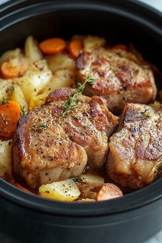 Reduce heat to low, cover, and simmer for 30–40 minutes, until the pork chops are tender and fully cooked (internal temperature: 145°F / 63°C).