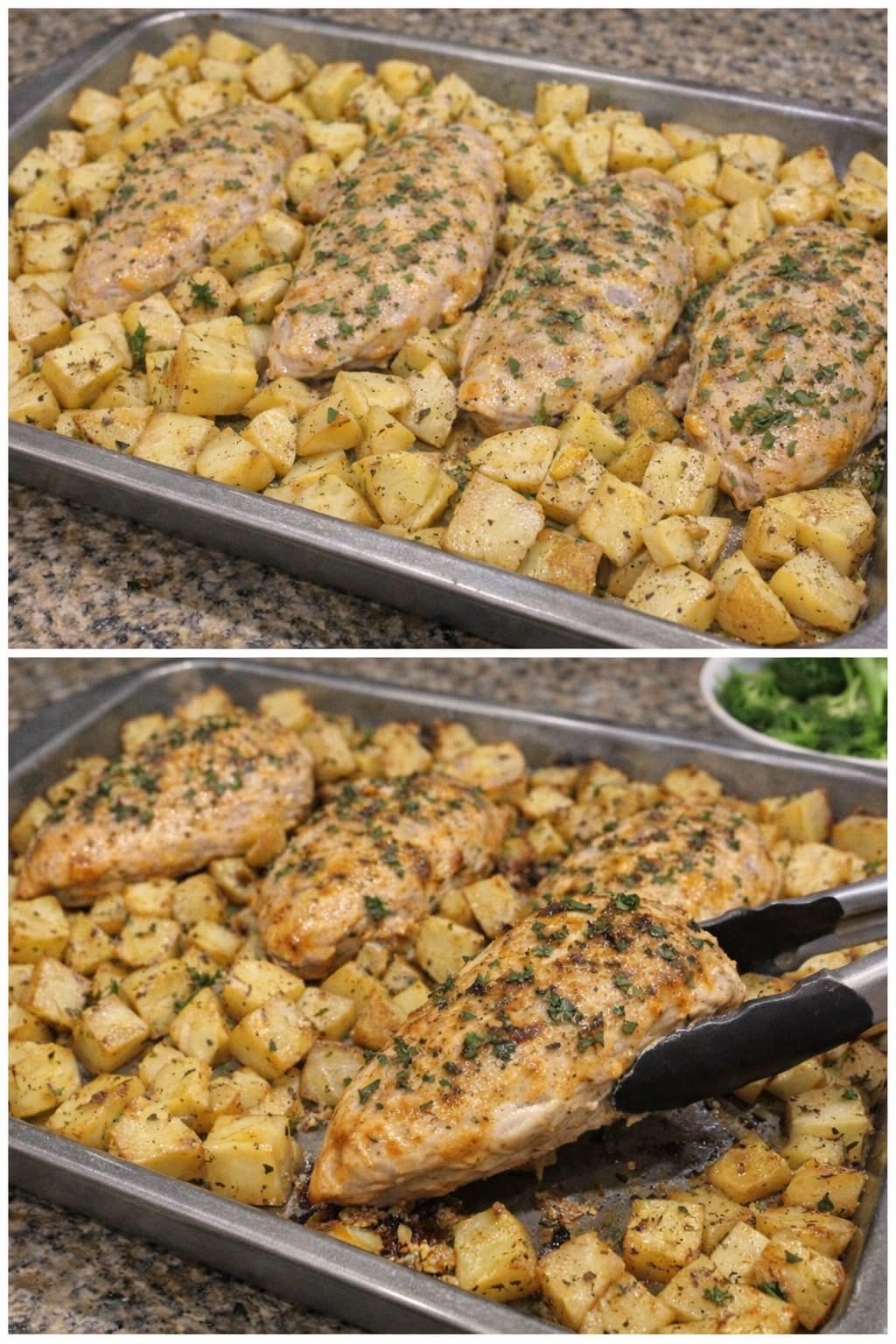 Bake for 40–50 minutes, until chicken reaches 165°F and potatoes are tender.