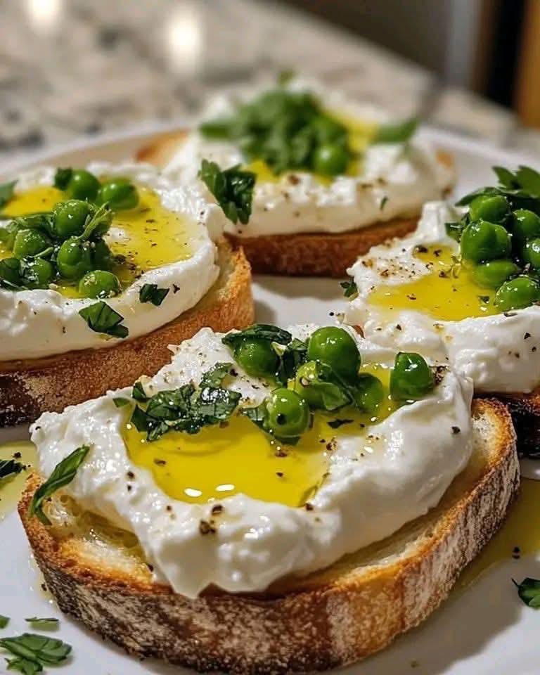 Spread a generous amount of burrata on each crostini. Top with the pea mixture.