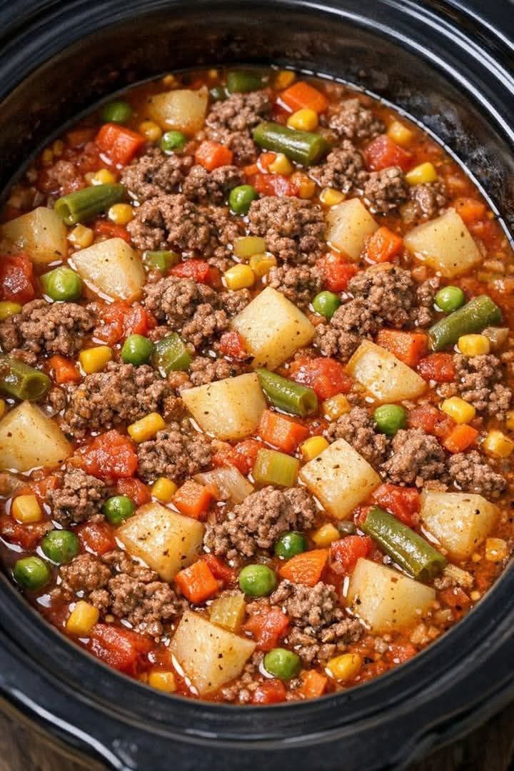 Ground beef and vegetable stews have roots in many culinary traditions, especially in American and European home cooking. This version reflects the practicality of modern kitchens, where slow cookers simplify traditional simmered dishes. It embodies the idea of stretching ingredients to feed a family—making it both economical and nourishing.
