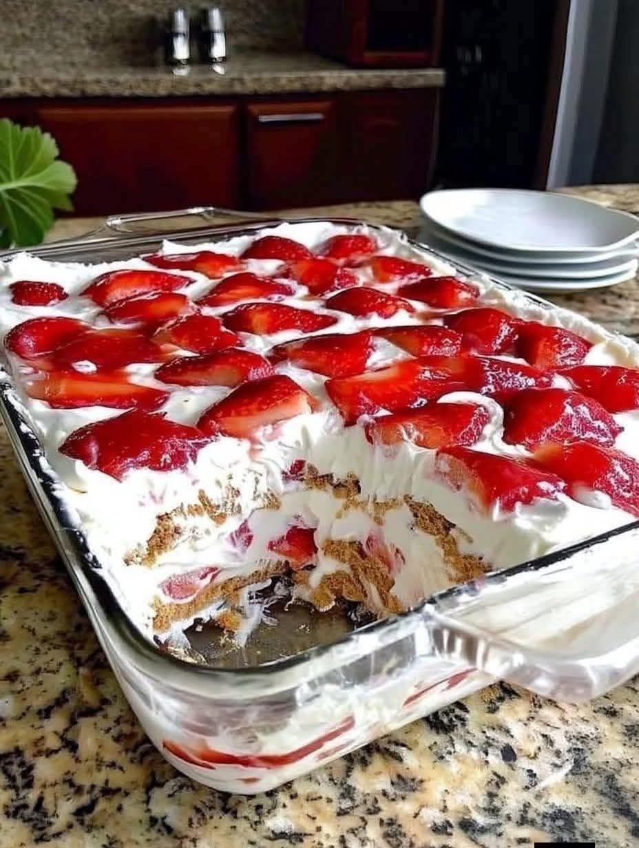 Repeat the layers (cookies → cream → strawberries) until all ingredients are used, finishing with cream on top.