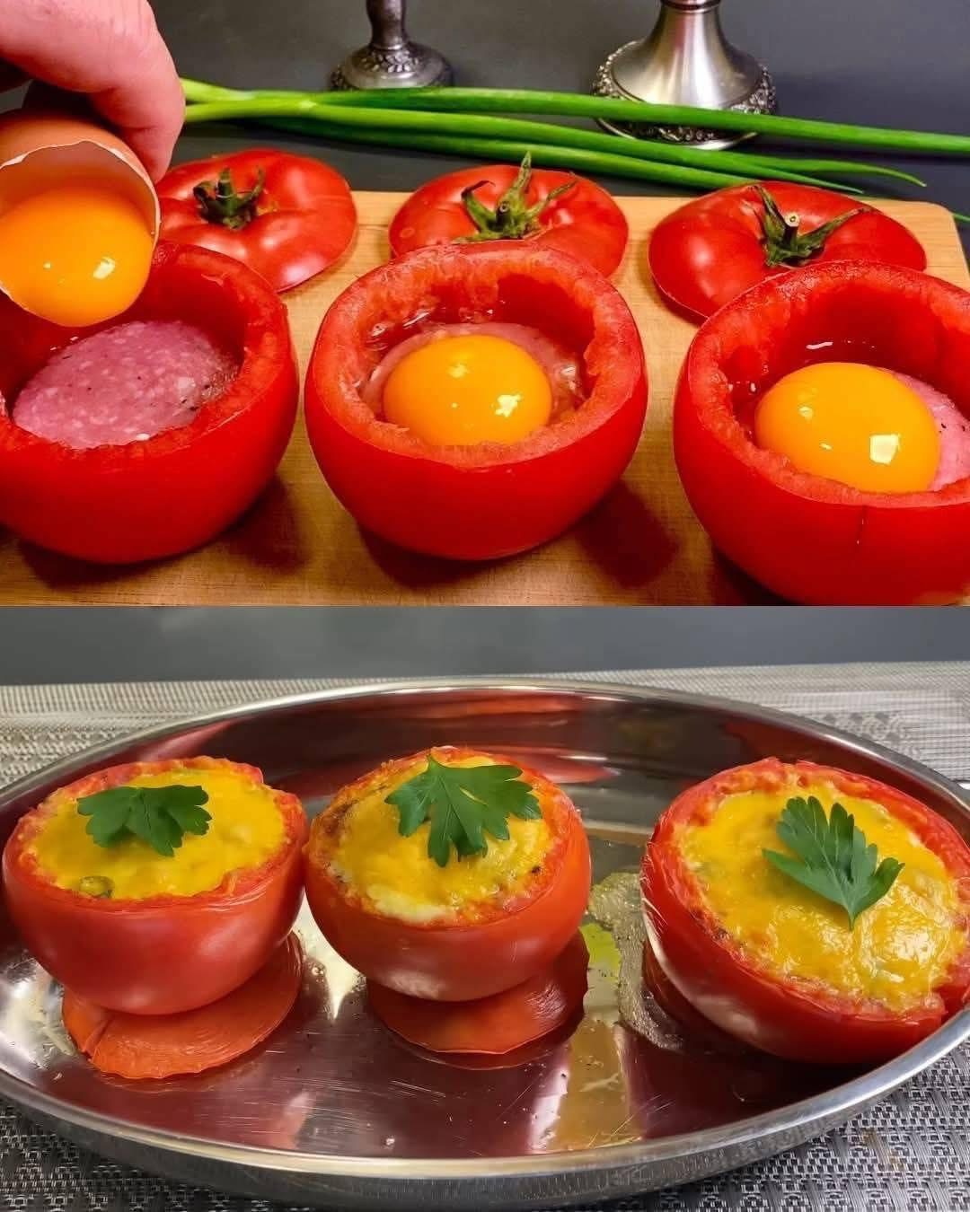 Juicy roasted tomatoes filled with savory sausage, baked eggs, and melted cheese—a delicious mix of creamy, cheesy, and fresh flavors!Tips: