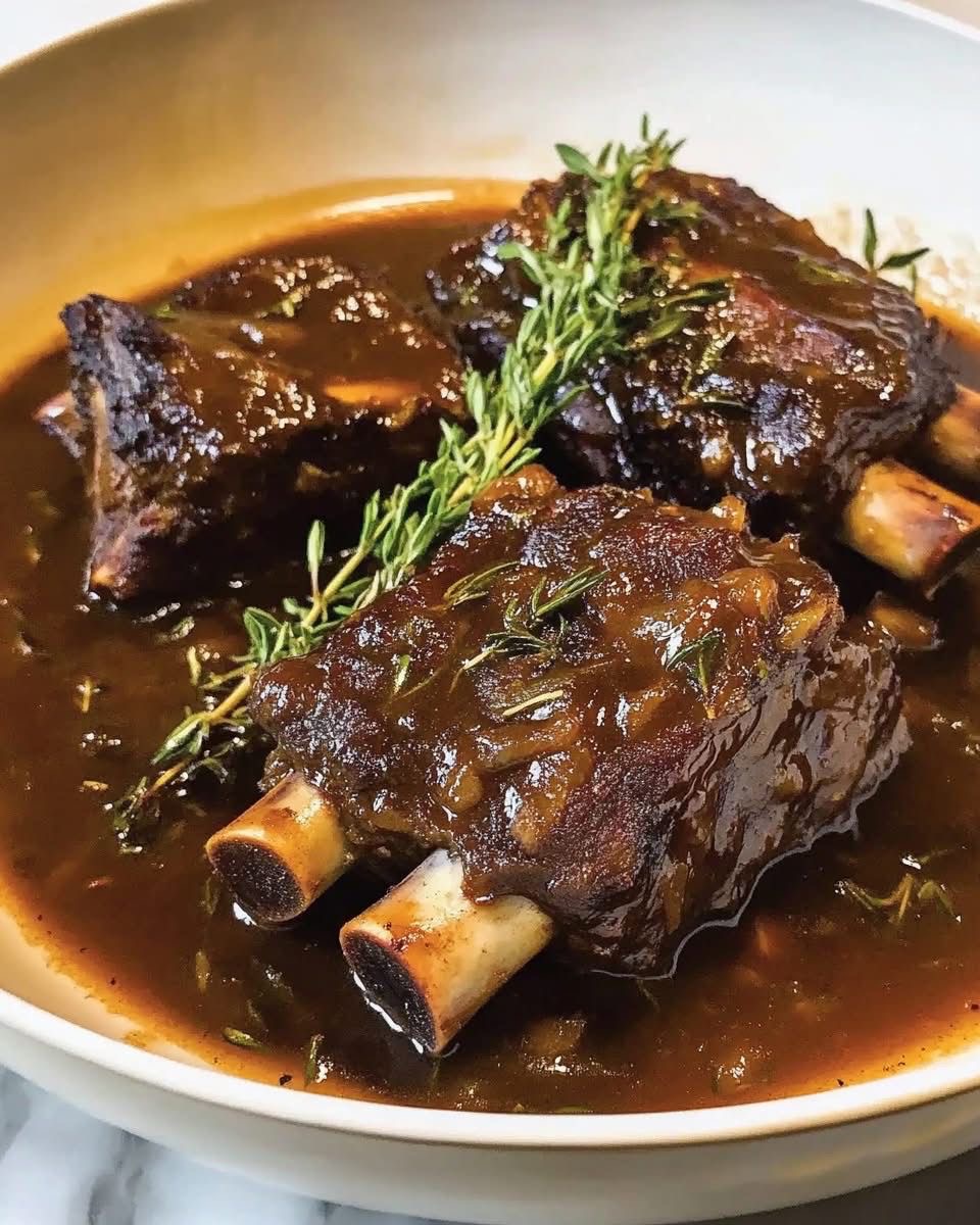 🍷 Rustic Red Wine–Braised Beef Short Ribs in Velvety Herb-Infused Gravy