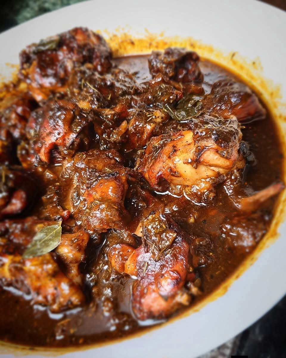 Add sliced carrots and bell peppers, then reduce the heat to low. Cover and simmer for 30–35 minutes, stirring occasionally, until the chicken is tender and the gravy thickens.