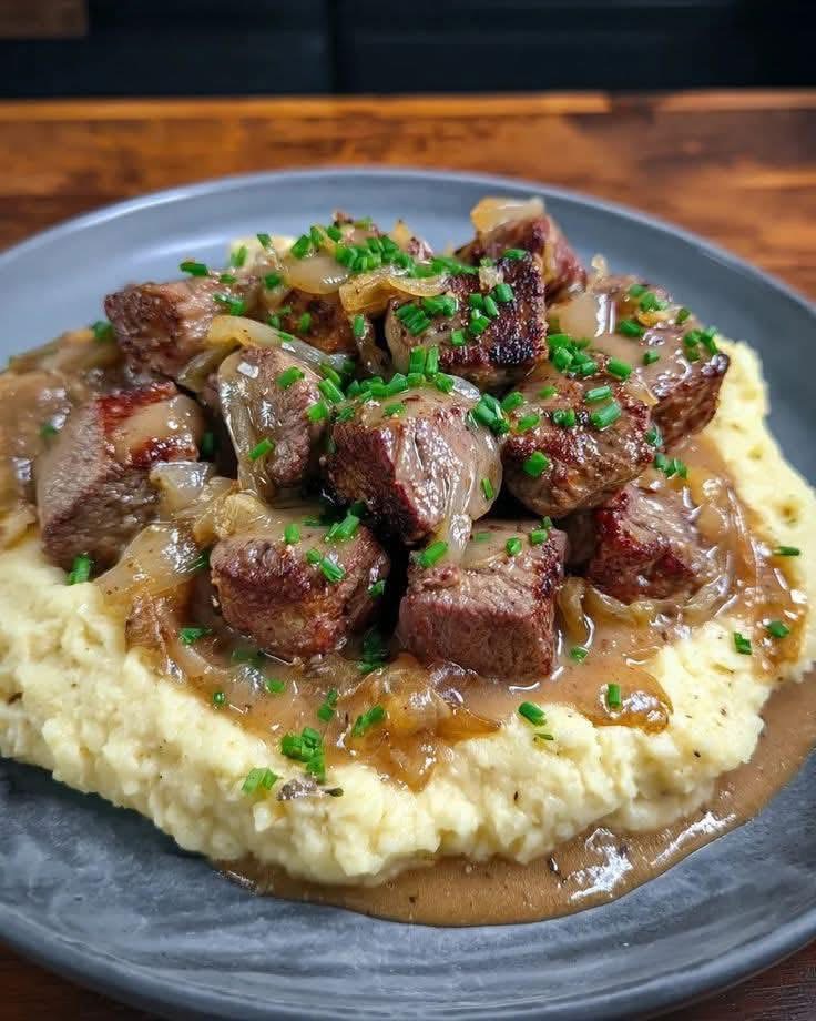 This recipe uses simple ingredients that come together beautifully. Beef steak, cut into chunks or thick slices Salt and black pepper Garlic powder Onion powder Butter Olive oil Yellow or sweet onions, sliced Beef broth Worcestershire sauce Flour or cornstarch for thickening Fresh chives or parsley for garnish Potatoes Milk or cream Butter for mashed potatoes