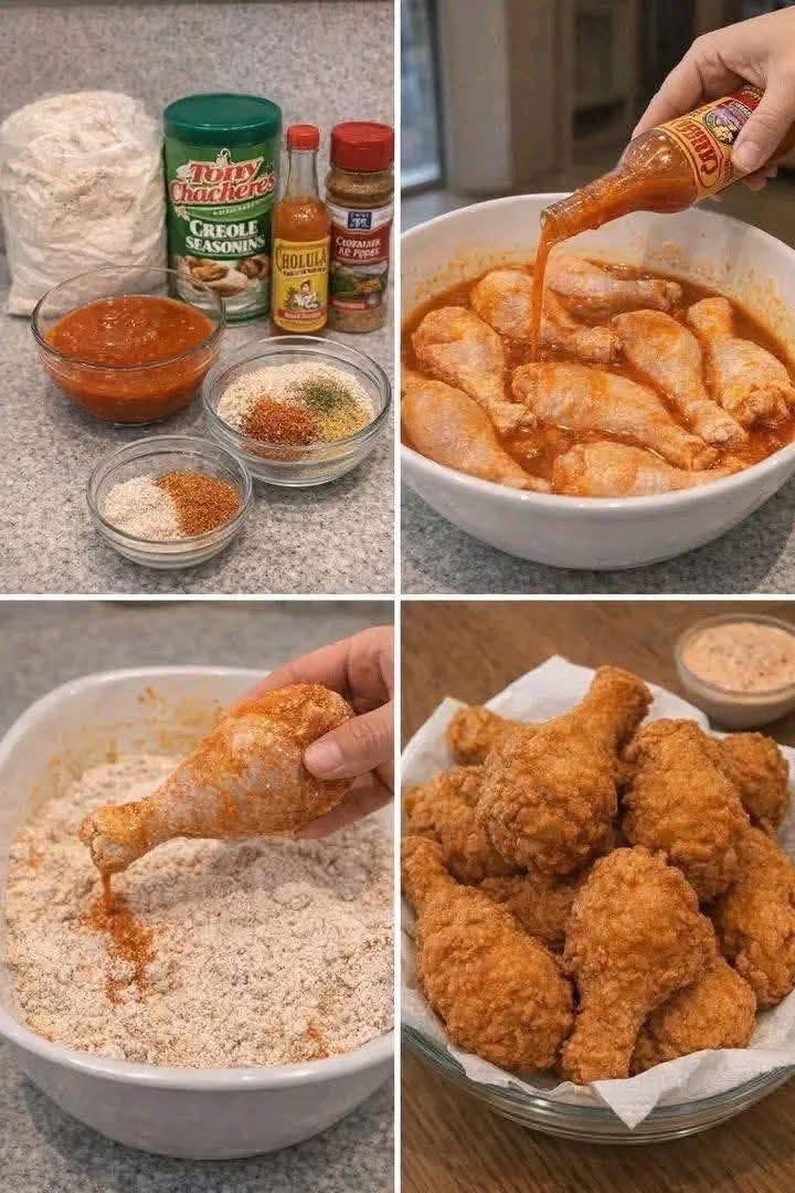 - Prepare the Chicken and Marinade: Begin by thoroughly cleaning your chicken drumsticks under cold water. Pat them completely dry with paper towels. This step is crucial for both the marinade adhesion and achieving a crispy skin. In a large bowl or a resealable plastic bag, combine the buttermilk, Cholula hot sauce, tomato paste (or ketchup), 1 tablespoon of Tony Chachere’s Original Creole Seasoning, 1 teaspoon of cayenne pepper, 1 teaspoon of smoked paprika, 1 teaspoon of garlic powder, and 1 teaspoon of salt. Mix well until all ingredients are thoroughly combined.