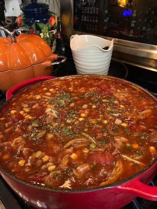 Add potatoes, green beans, corn, diced tomatoes, and beef broth. - Season & simmer