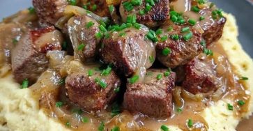 Juicy Sliced Steak with Rich Gravy and Creamy Mashed Potatoes The Ultimate Comfort Food Dinner Juicy sliced steak with rich…