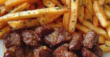 🥩🧄 Garlic Butter Steak Bites with Crispy Golden Fries 📝 Ingredients : 1 lb steak (cut into cubes, juicy tender…
